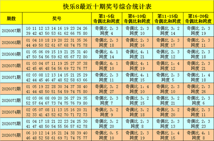 福彩好意思瞻念8第2026076期开奖追念奖号:06 10 12 14 16 21 24 38 39 40 46 48 52 58 61 69 71 74 75 77,其中奖号奇偶比为7:13,大小比为7:13,跨度为71。