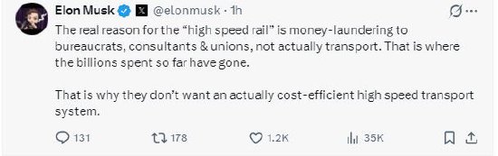 驰盈策略马斯克回复称:“这条‘高铁’的确实策画并非为了交通,而是为了给官僚、护士人和工会洗钱。迄今截止参预多数资金齐用在了这些方面。这便是为什么他们不思要一个真肃穆济高效的高速交通系统。”
