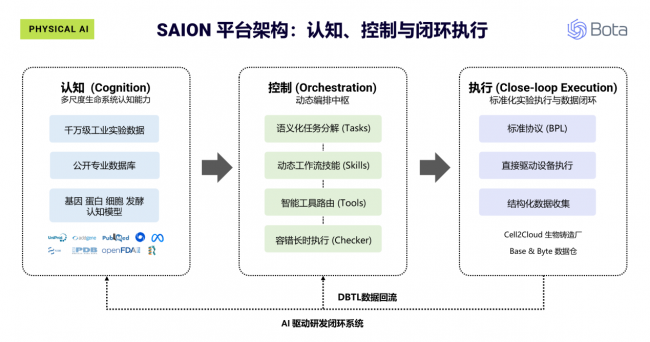 SAION AI并非是停留在虚构联想的AI智能体或单一扩充的实际自动化器用,而是一个包含领会、限制与闭环扩充才气,能完了自主联想、径直参与并优化生物发现与分娩工艺的 Physical AI 平台。它能凭据科研意图生成可扩充的实际决议,通过恩和自研的生物表率契约话语(Biology Protocol Language,BPL)直达生物锻造厂,表率化地完成的真是际,并在数据闭环回流中捏续进化,以科罚生物制造限制研发及分娩链路冗长、工序茂密、数据割裂,高度依赖东说念主工教授与反复试错的行业挑战。
