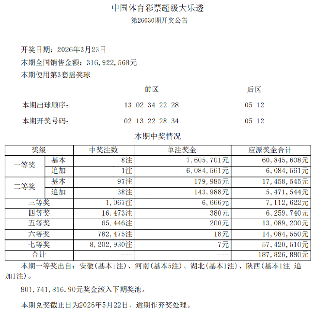 本期宇宙开出8注一等奖,单注奖金760万元,其中1注为追加投注,多得608万奖金。追加头奖落于陕西;7注基本头奖分落3地,其中河南专揽5注,或爆3800万大奖,安徽、湖北各1注。二等奖开出97注,单注奖金17.9万余元,其中38注继承追加投注,每注多得奖金14.3万余元。本期宇宙销量为3.16亿元,开奖后奖池余额8.01亿,阐述大乐透新规,下期固定奖奖金将按8亿以上对照。