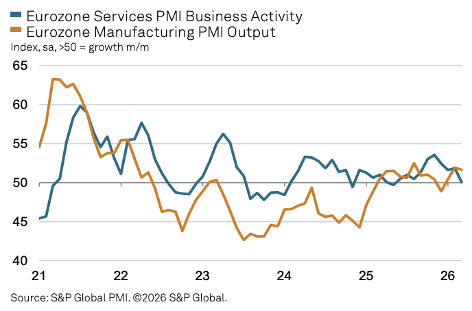 据标普专家(S&P Global)周二公布的初值数据,欧元区3月详尽PMI从2月的51.9降至50.5,低于分析师预期的51,创下昨年5月以来最低水平,但仍拼集守住50这一隆替分界线。工功课PMI初值跌至50.1,远不足预期的51.1;制造业PMI初值则逆势升至51.4,创45个月新高,好于预期的49.6。