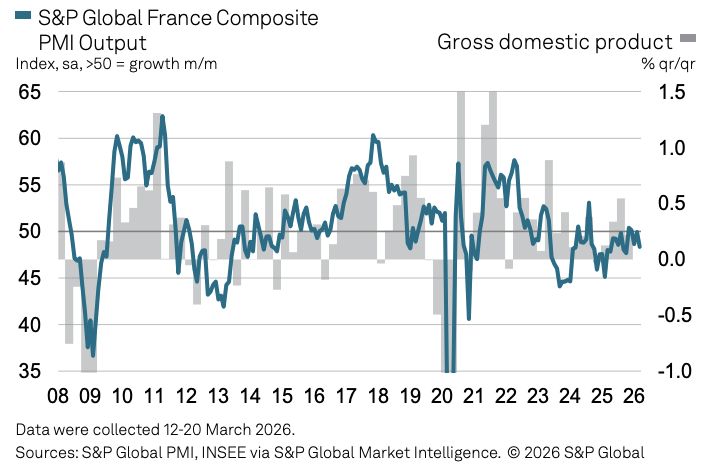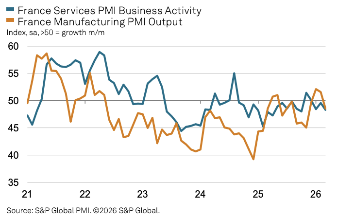 法国的处境更为严峻。3月详尽PMI从49.3进一步滑落至48.3,创五个月新低,相接第三个月处于隆替线以下,相同差于彭博看望预期的49.3。工功课PMI降至48.3,制造业虽仍处延伸区间但对举座状貌的支抓有限。