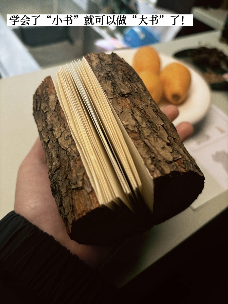 用迷你树桩和纸张亲手缝制的小书。 受访者提供