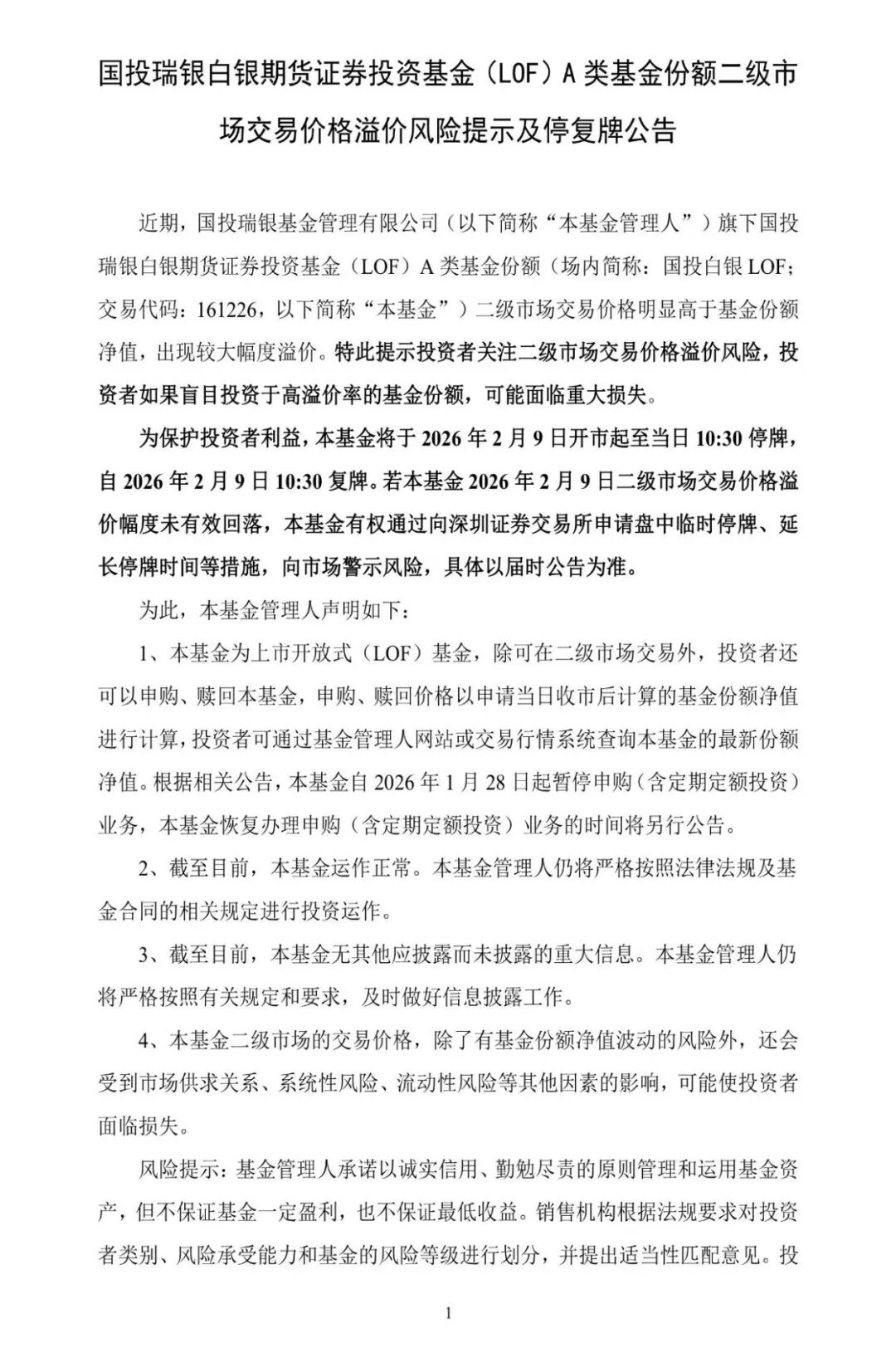 为保护投资者利益,基金将于2026年2月9日开市起至10:30停牌,自2026年2月9日10:30复牌。若当日溢价幅度未灵验回落,基金有权摄取进一步容貌。