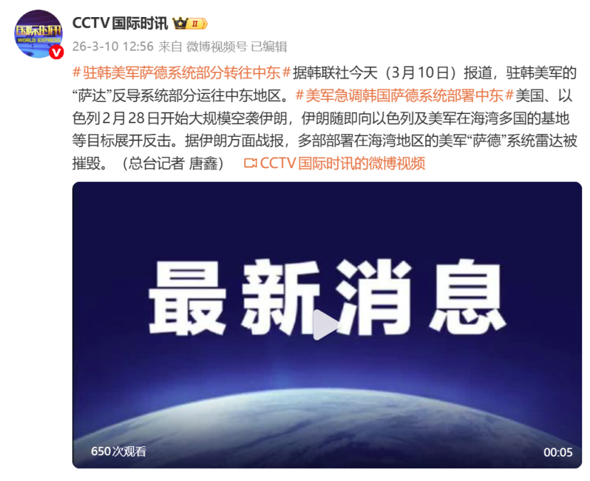 据韩联社今天(3月10日)报说念,驻韩好意思军的“萨德”反导系统部分运往中东地区。