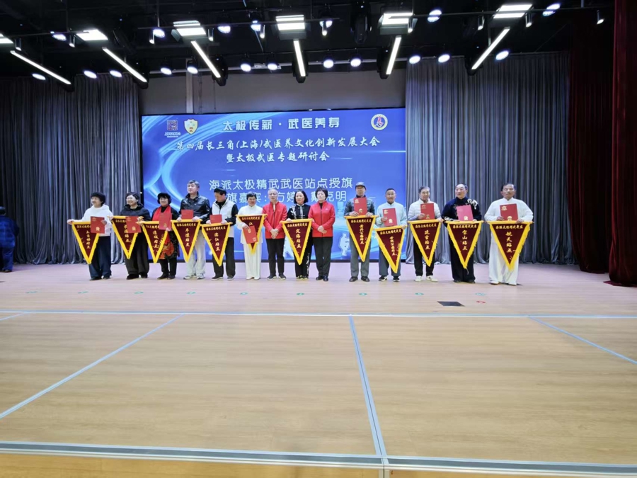 上海精武体育总会副会长方婷(右六)、戴克明(左七)向海派太极精武武医站点授旗