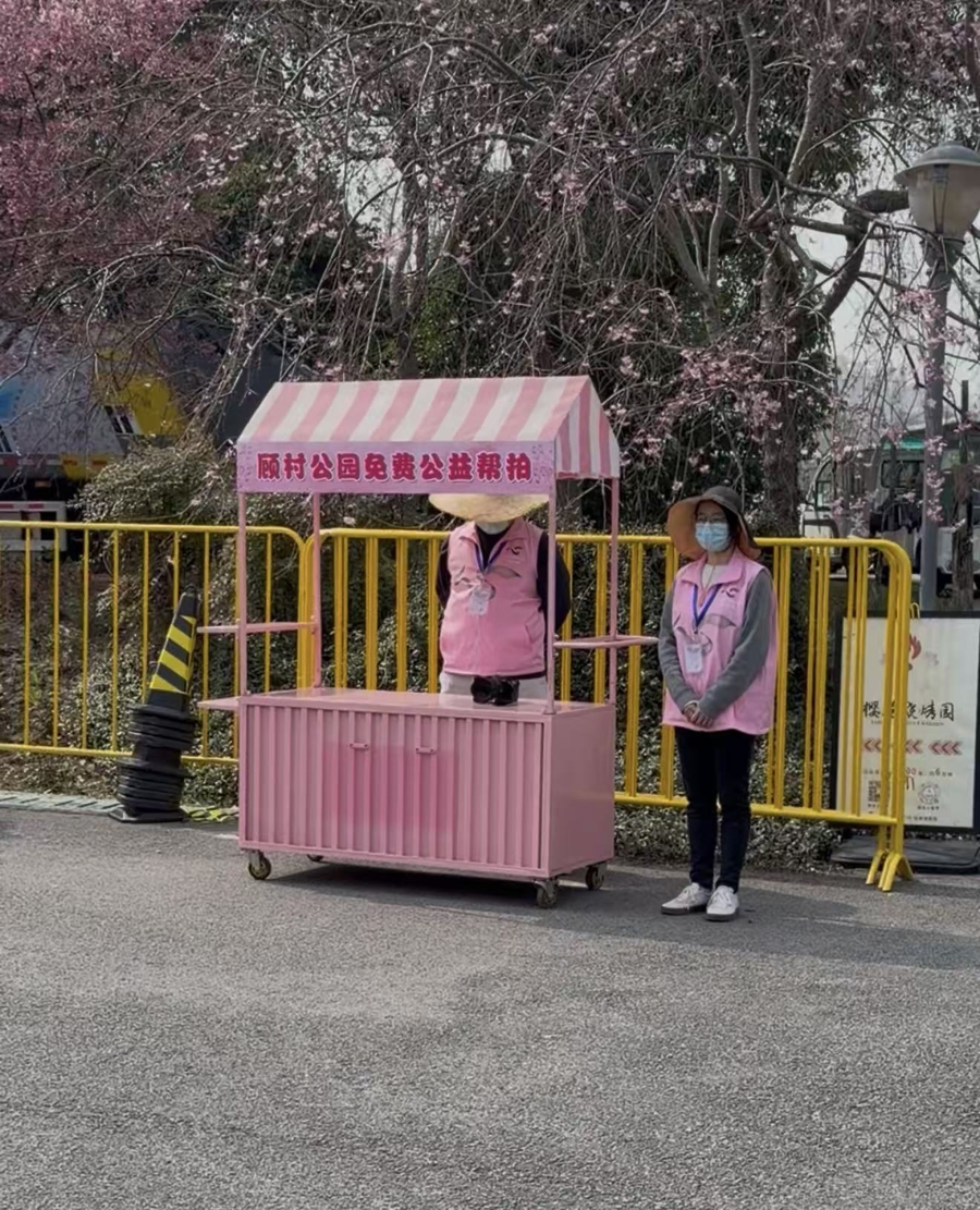 在2号门隔邻,记者还把稳到一处相配的门径,一辆带有粉白色顶棚的小推车出刻下樱花密集处,推车上方标有“顾村公园免费公益帮拍”。记者看到,小推车隔邻,有数位身着粉色马甲的责任主谈主员,手抓相机为搭客拍照,忙得不成开交。